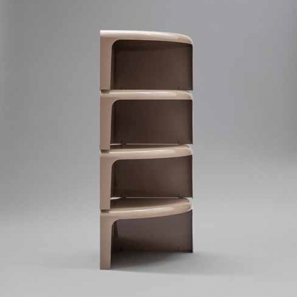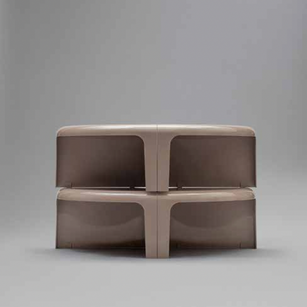 From the drawing board of Rodolfo Bonetto in 1969, 4/4 represents the typical multi-functional product that can easily adapt to setting and use, in this way allowing continually new interpretations of the spaces in which we live. Curving lines, glossy plastic and easy dovetailing turn the four elements making it up into a round coffee table, a serpentine table, a modular bookcase or even a corner shelving.