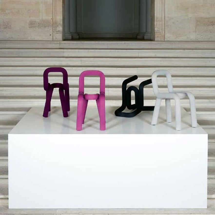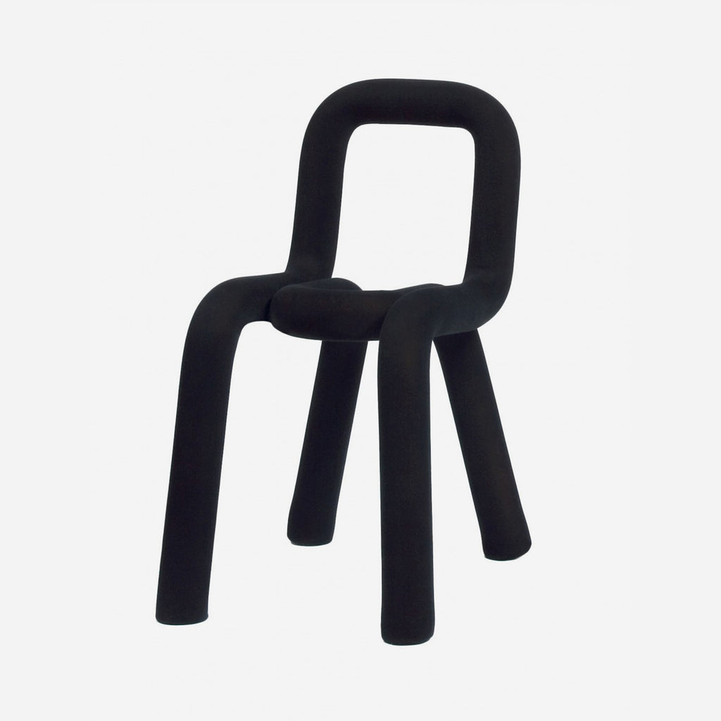 Made up of two tubular parts in metal embedded in each other, the Bold chair is an updated version of the tradition of a bended chair in tubular steel. Inflated with a thin polyurethane foam, the line drawn by the Bold successfully plays the role of foot, seat then back and gives it an amazing level of comfort. With a single stroke, in the manner of the Osvaldo Cavandoli Linea, and thickened similarly to the font which is made bold, the Bold chair succeeds in doing away with the seat and back.