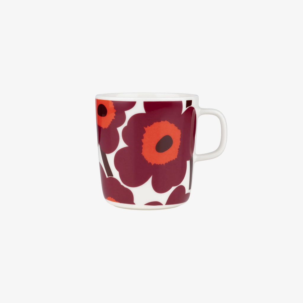 The Oiva mug with Unikko pattern is made of white stoneware that is dishwasher, oven, microwave and freezer proof.
