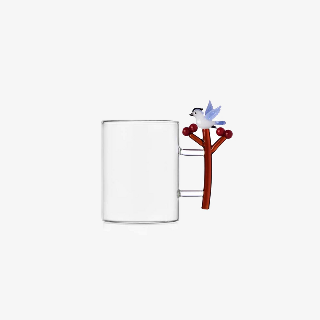 Featuring a delicate glass design with a whimsical tree branch handle adorned with red berries and a light blue bird, this hand-crafted mug captures the magic of the season. Perfect for cozy mornings or festive gatherings.