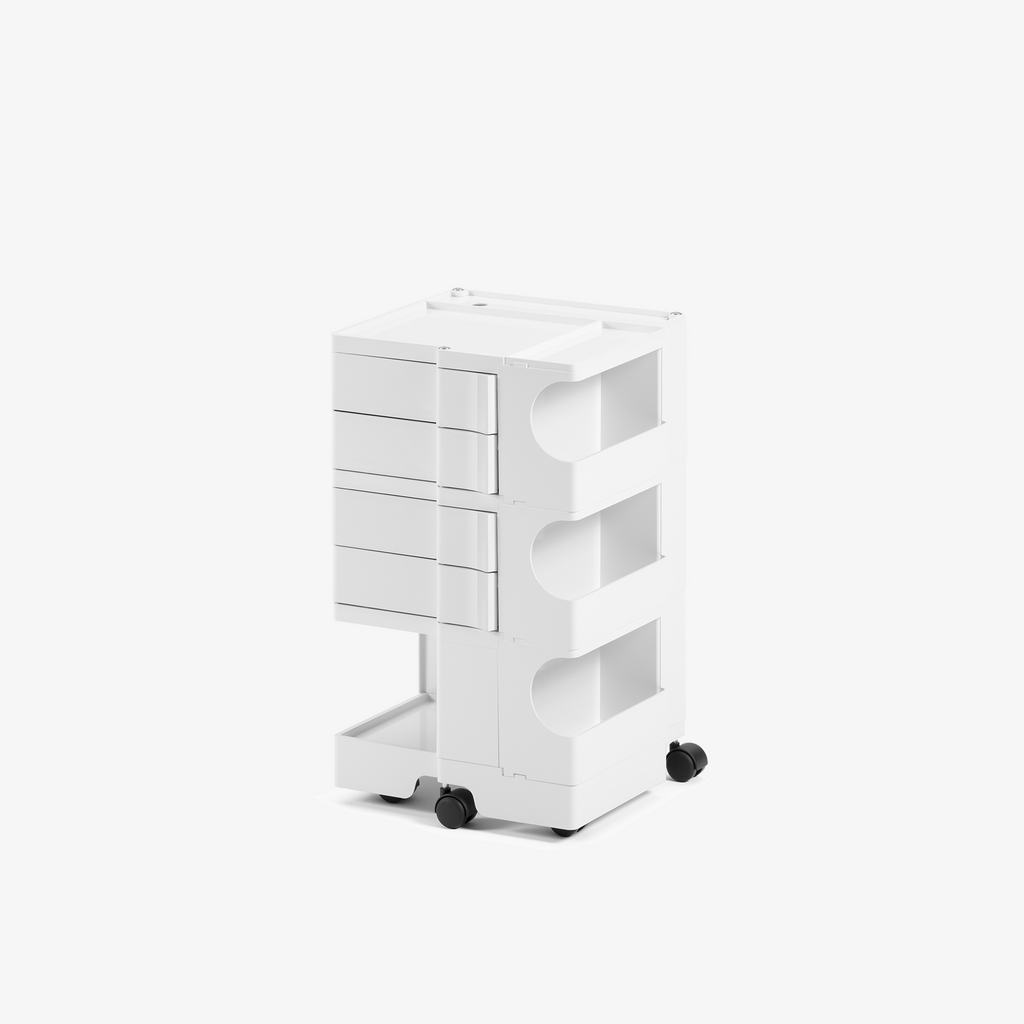 Boby is much more than a simple container: it is the trolley storage unit that made design history. Functionality and detail are its strong points which, together with an undeniably pop flavour, continue to make it the most popular storage trolley in creativity sectors as well as in the medical, and in the home. Designed with injection-moulded ABS plastic drawers and compartments that guarantee simple vertically modular solutions, Boby provides versatile customized storage capacity, while its polypropylene casters guarantee full mobility.