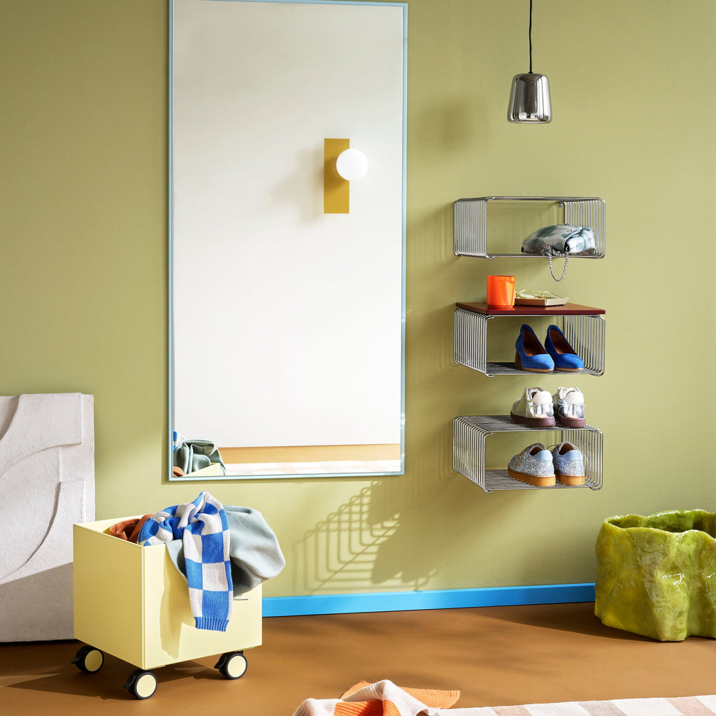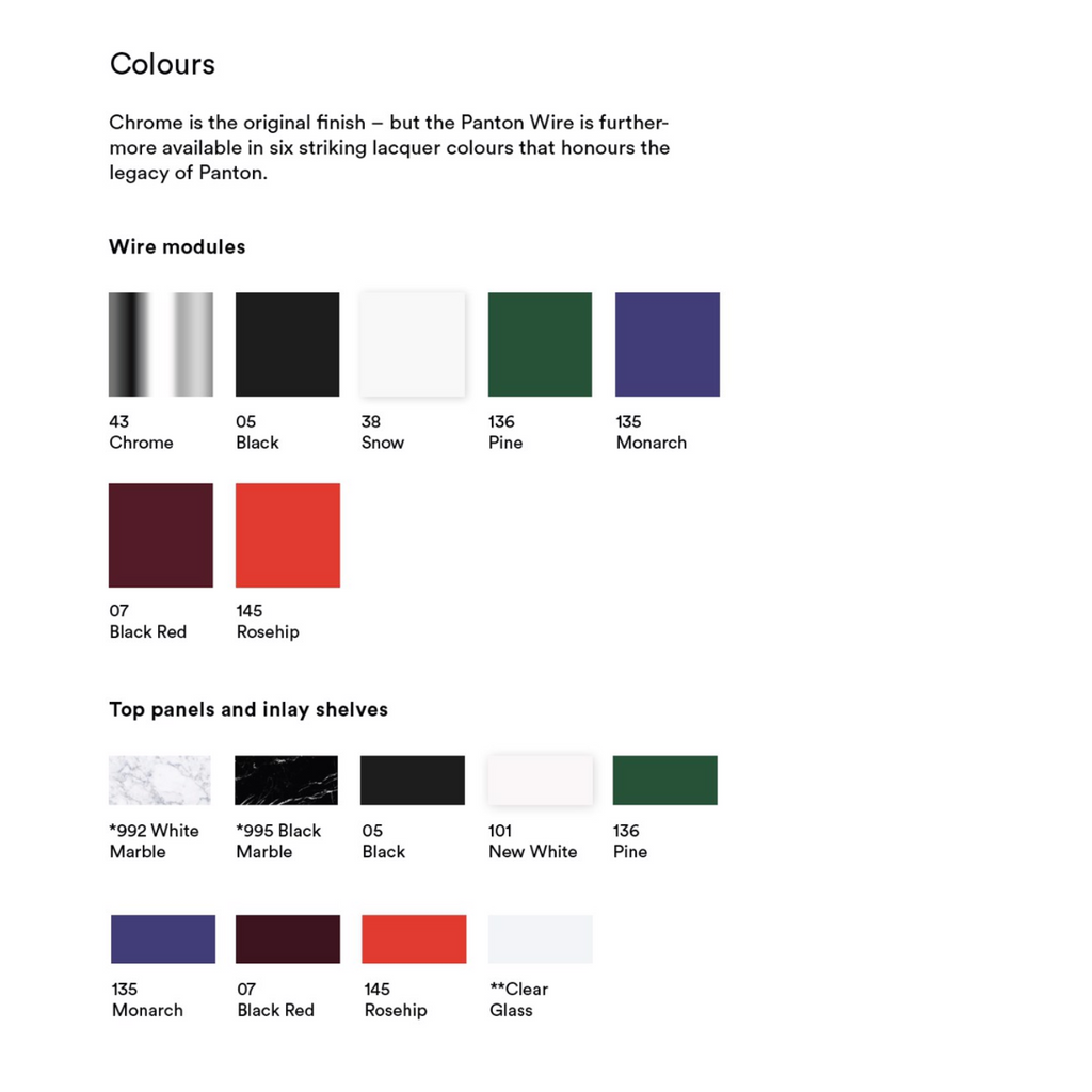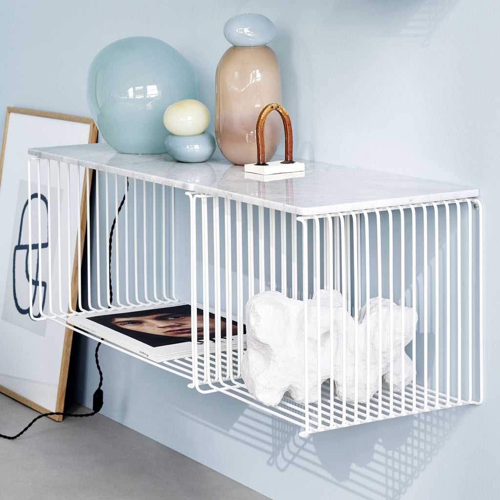 The Panton Wire system offers a variety of sizes and depths to suit your storage and display needs. Choose from single or double modules in different depths and colours, allowing you to configure the system to fit your space perfectly. Each module comes with feet and suspension brackets.
