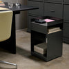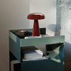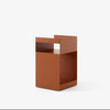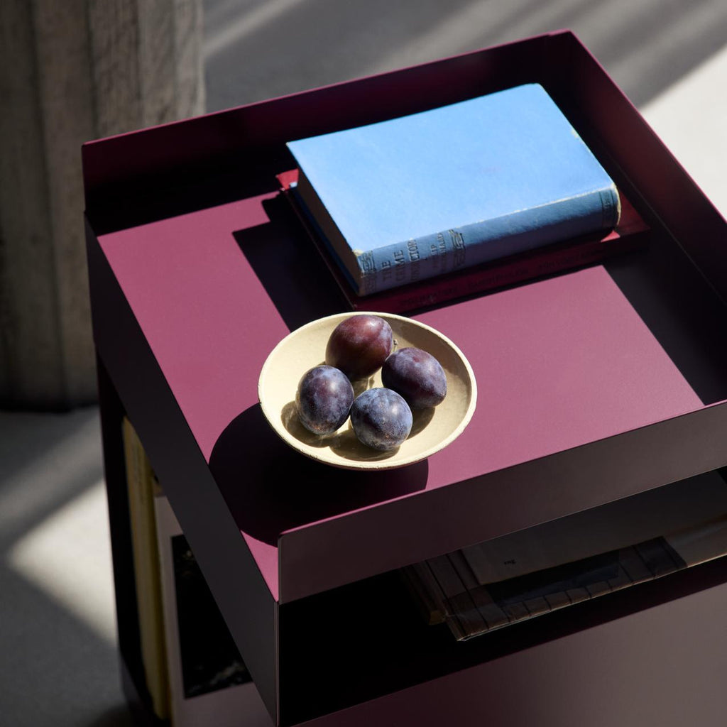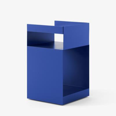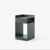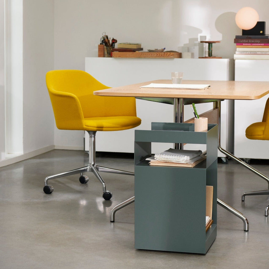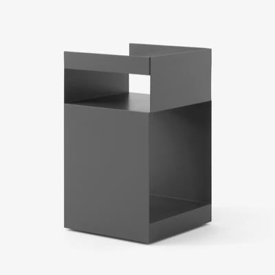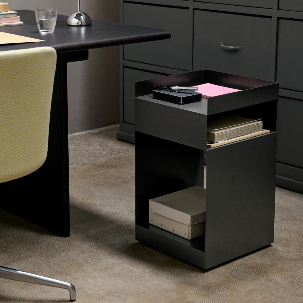 The Rotate trolley is made out of one piece of sheet metal, which is cut into two pieces and bent afterward. Finally, the two pieces are welded together and powder coated. An MDF block is then placed in the base.