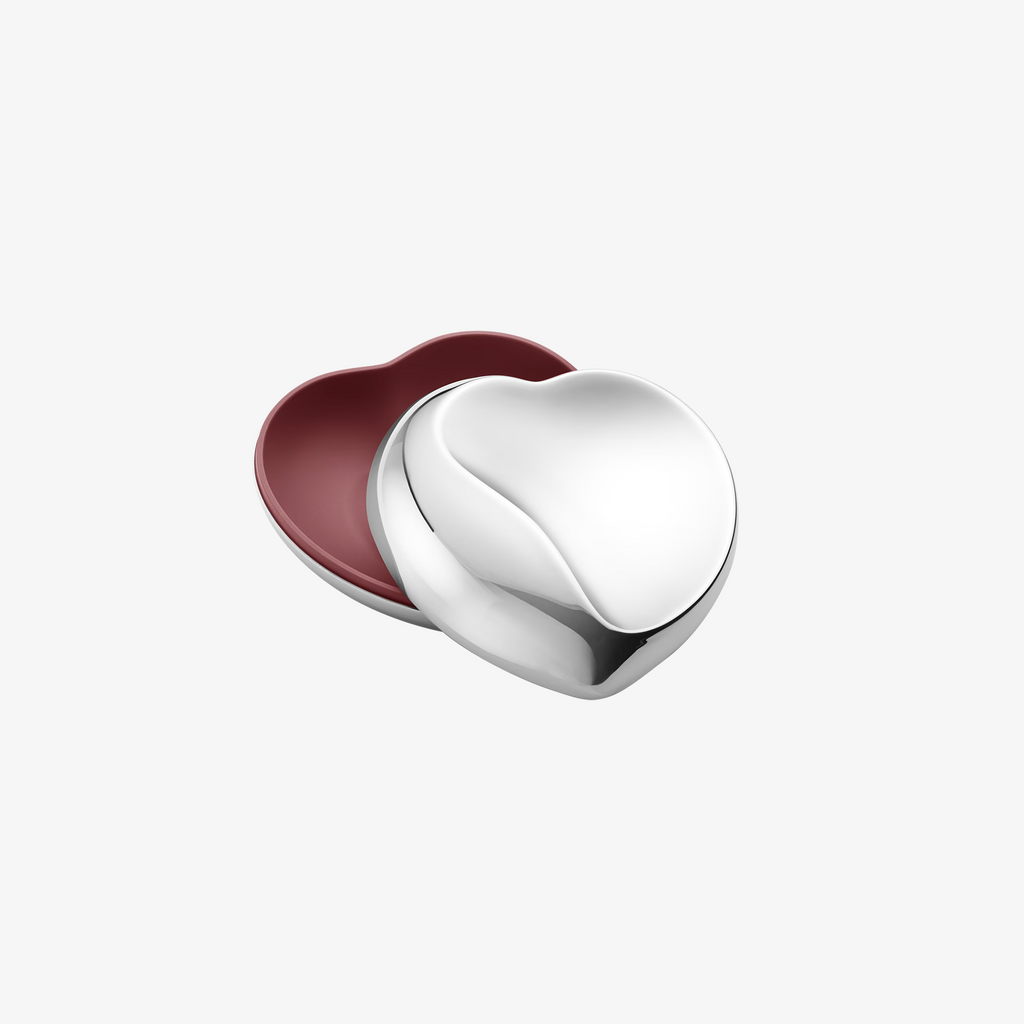 Crafted in mirror-polished stainless steel, this charming heart-shaped box makes an ideal gift for Mother's Day and birthdays. The piece is perfect for storing small and medium-sized pieces of jewellery. Its elegantly undulated surface allows for placing bracelets, bangles and other jewellery pieces on the lid when closed. Inside, the box is coated with a layer of burgundy-coloured silicone which helps prevent scratches.
