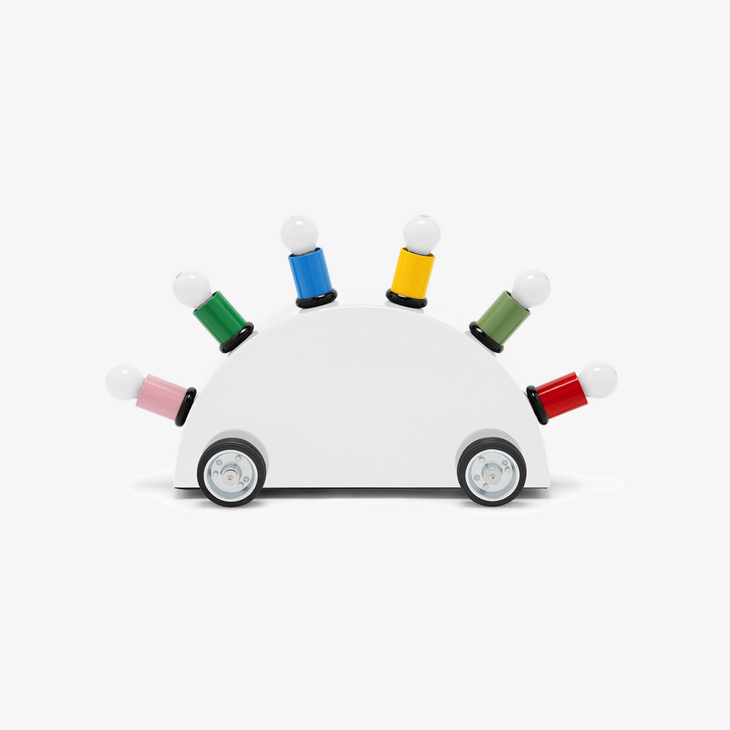 The Super lamp by the designer Martine Bedin can be dragged along like a dog on a leash (with an arched back resembling a stegosaurus), embodying the playful spirit of Memphis. It is made with a semicircle in lacquered fiberglass resting on four rubber wheels. Six coloured cylinders contain the sockets for the bulbs. The light bulbs themselves are part of the image of the lamp.