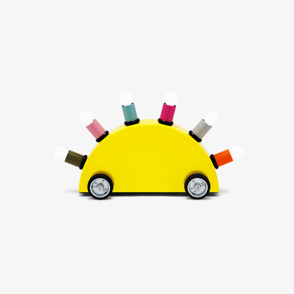 The Super lamp by the designer Martine Bedin can be dragged along like a dog on a leash (with an arched back resembling a stegosaurus), embodying the playful spirit of Memphis. It is made with a semicircle in lacquered fiberglass resting on four rubber wheels. Six coloured cylinders contain the sockets for the bulbs. The light bulbs themselves are part of the image of the lamp.