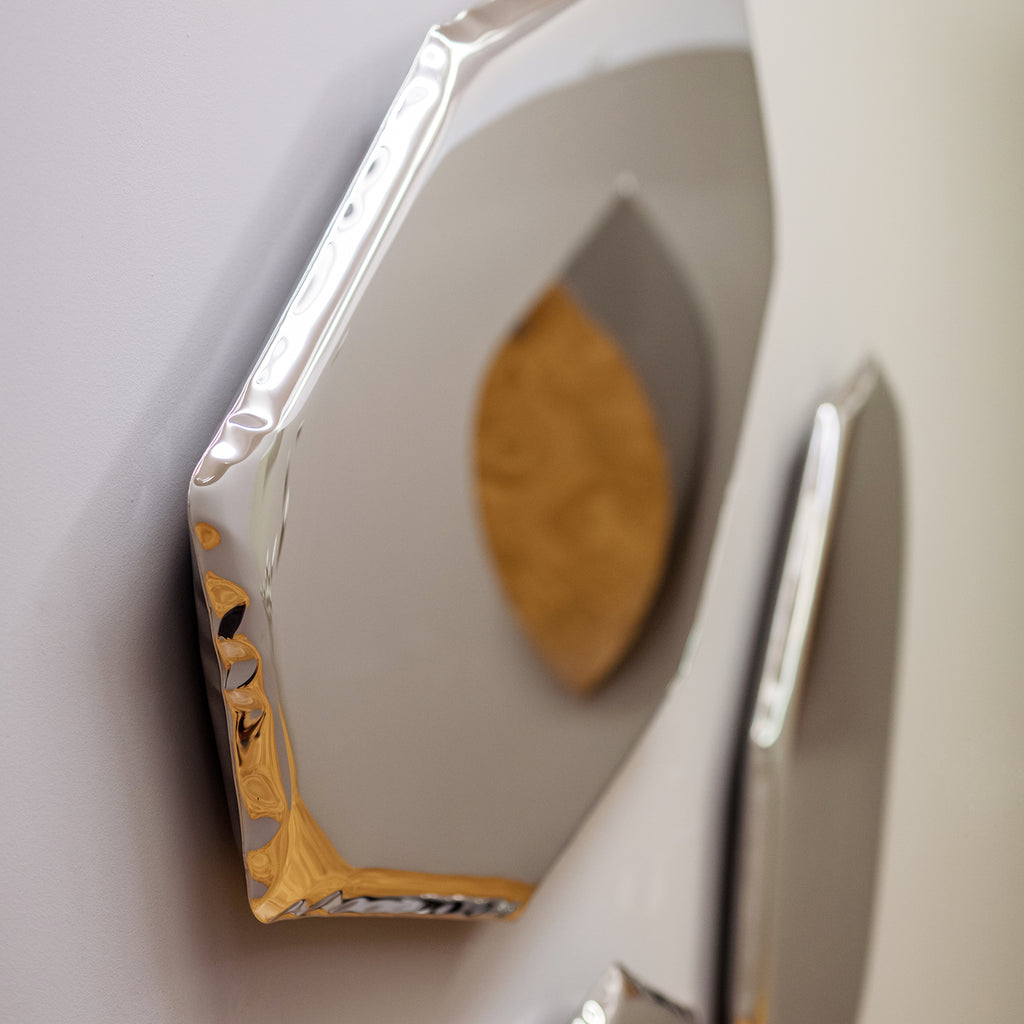 The geometric TAFLA C comes in different sizes – it can be arranged in an artistic personalized composition or exposed on a wall as a single sculpture-like mirror.
