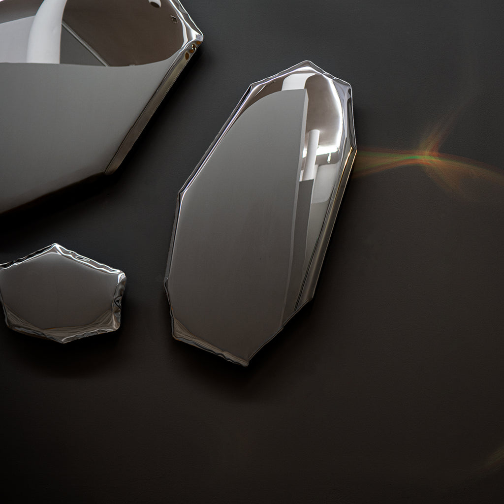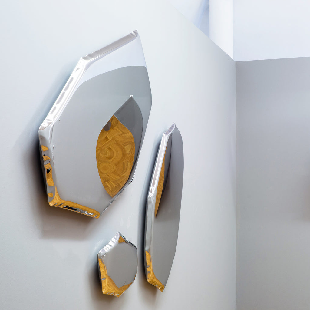 The geometric TAFLA C comes in different sizes – it can be arranged in an artistic personalized composition or exposed on a wall as a single sculpture-like mirror.