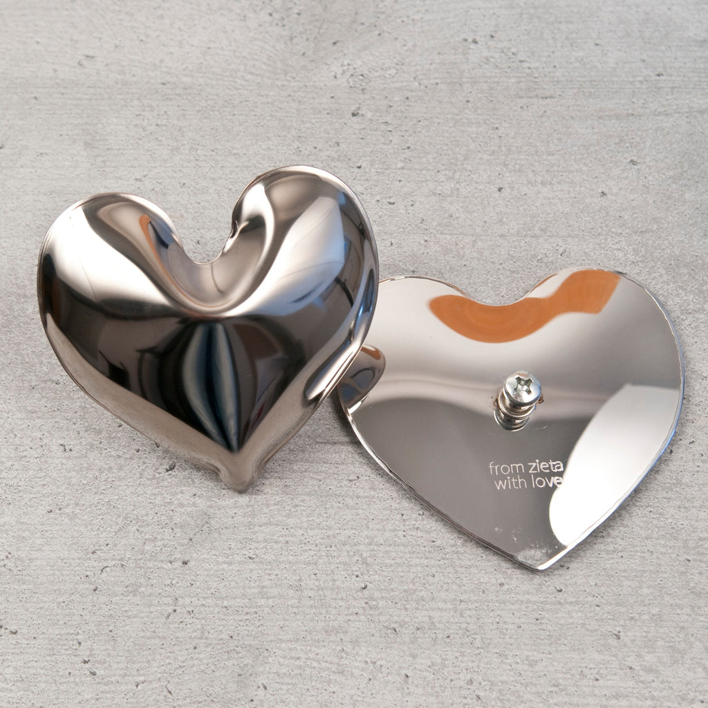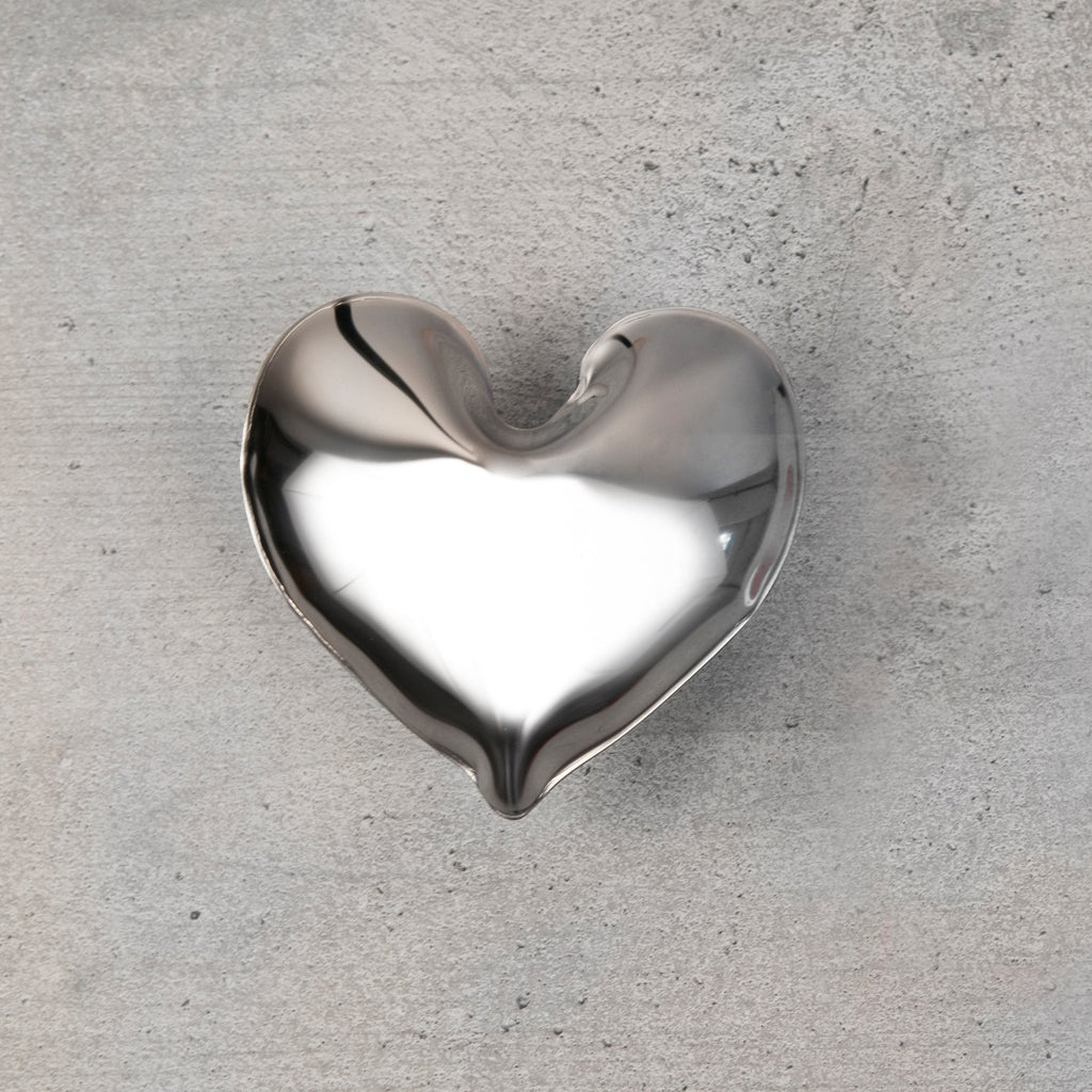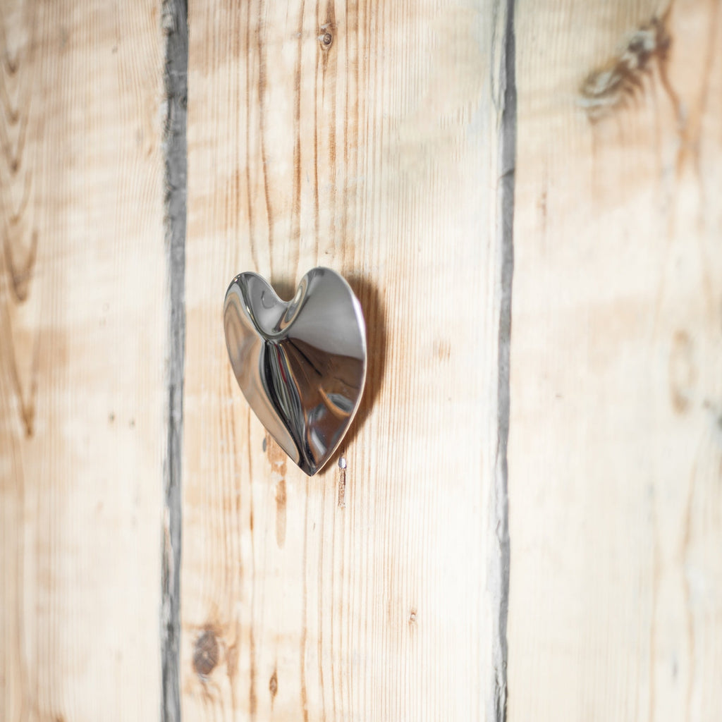 Hot Heart is designed as a small DIY steel accessory created by seam welding two sheets of metal. The product comes flat and sealed with our secret potion locked inside. At a temperature of 200ºC, it transforms from a flat two-dimensional object gaining a bulbous tridimensional form - the heart fills and becomes a sculptural 3D wall hanger. Just put it in the oven and it will grow!